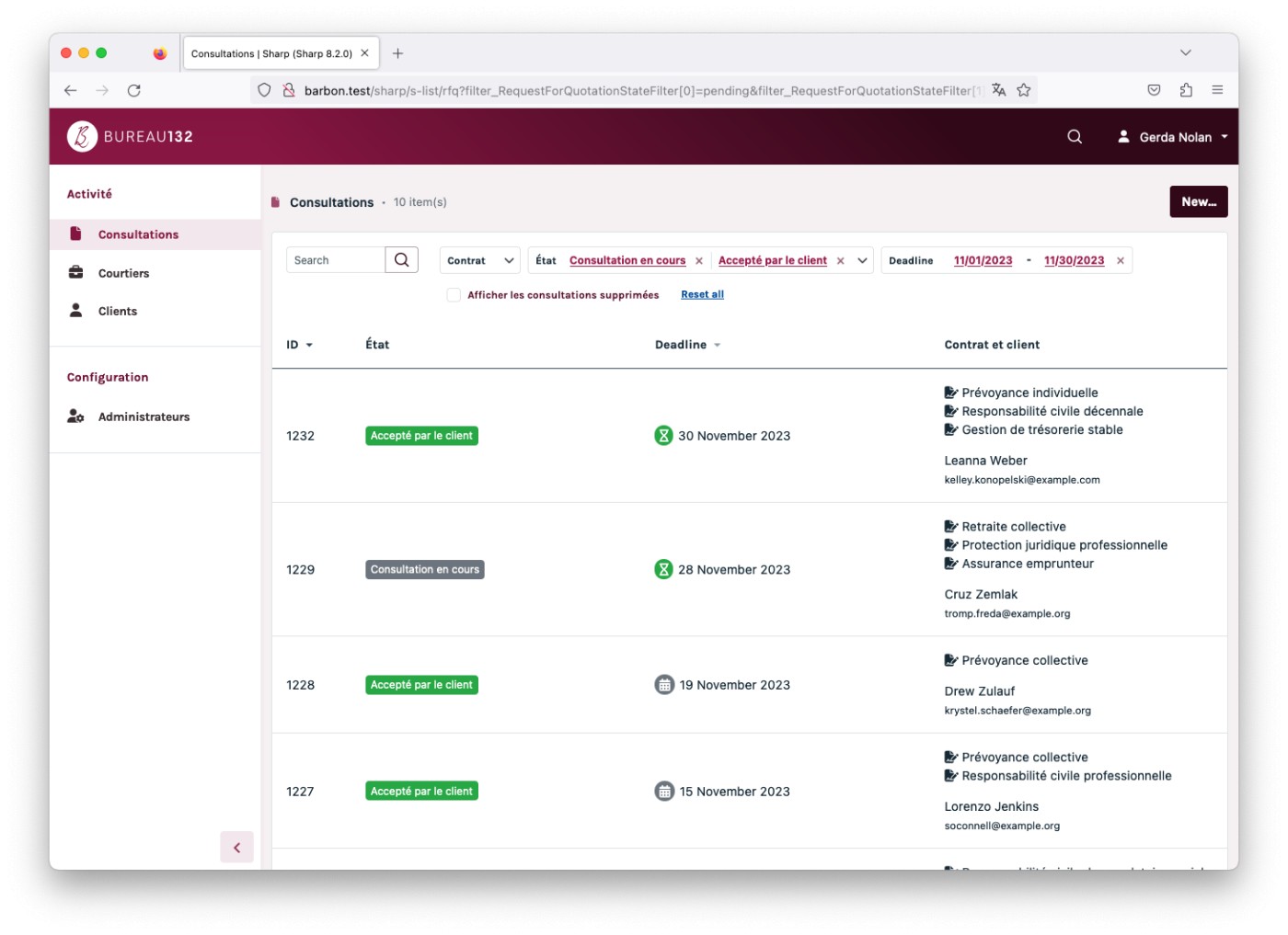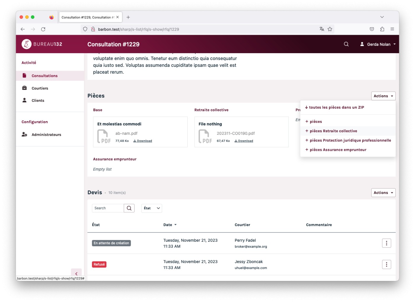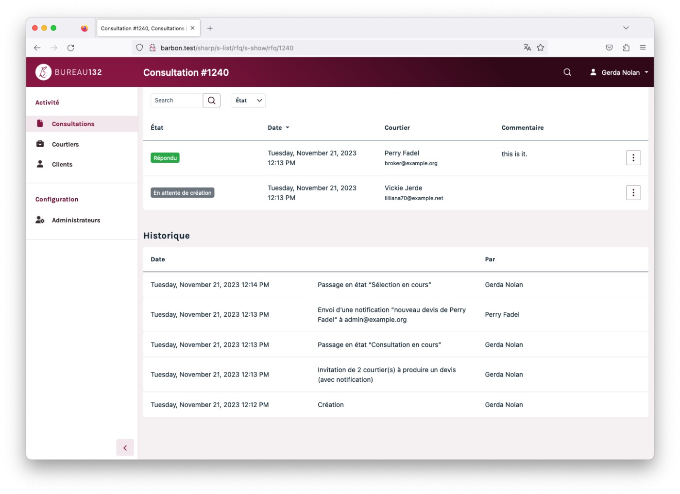 The client is Bureau 132 a French company that helps businesses to find the ideal solution for their insurance needs. It’s quite specific, but you can think of it as an intermediate between companies and insurance brokers. To do so, they needed an online tool to help them manage their customers, their contracts, their brokers... and to manage the workflow of a request for quotes and quote selection.