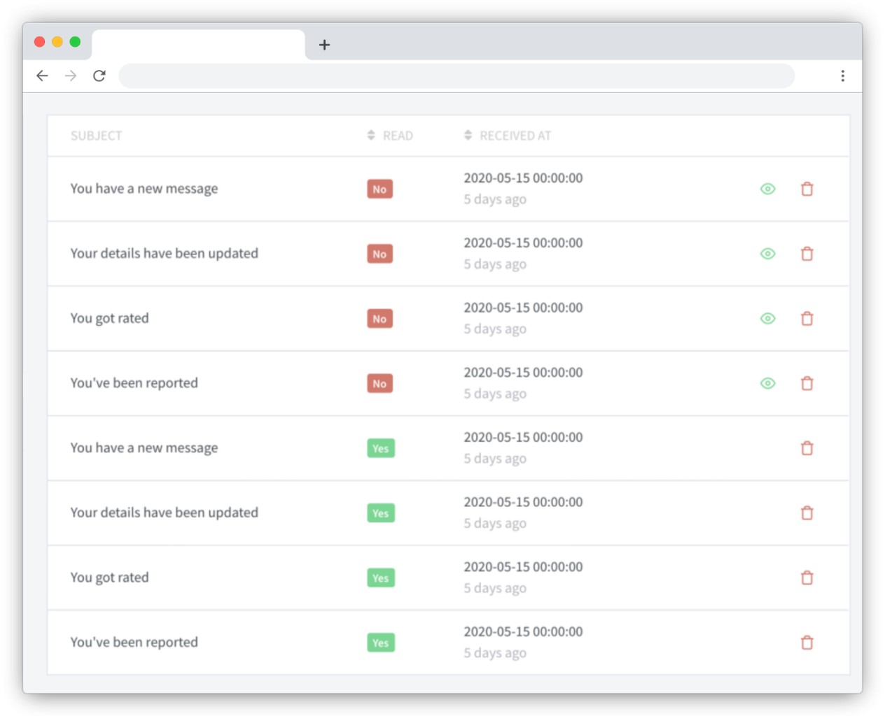 Then you are free to use that information to show those notifications inside your application. It is possible to customize the notification format, but by default there is a field dedicated to mark the notification as “read” by the target user.